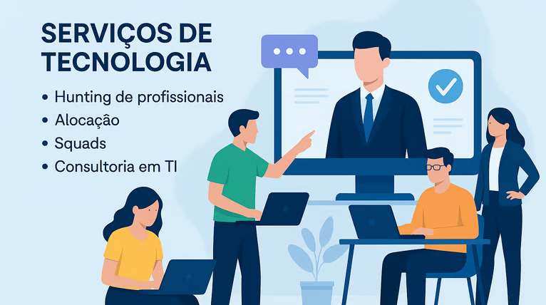 Hunting e alocação de profissionais de tecnologia, arquitetura de sistemas, Squads, revenda de Nuvem, consultoria, entre outros.